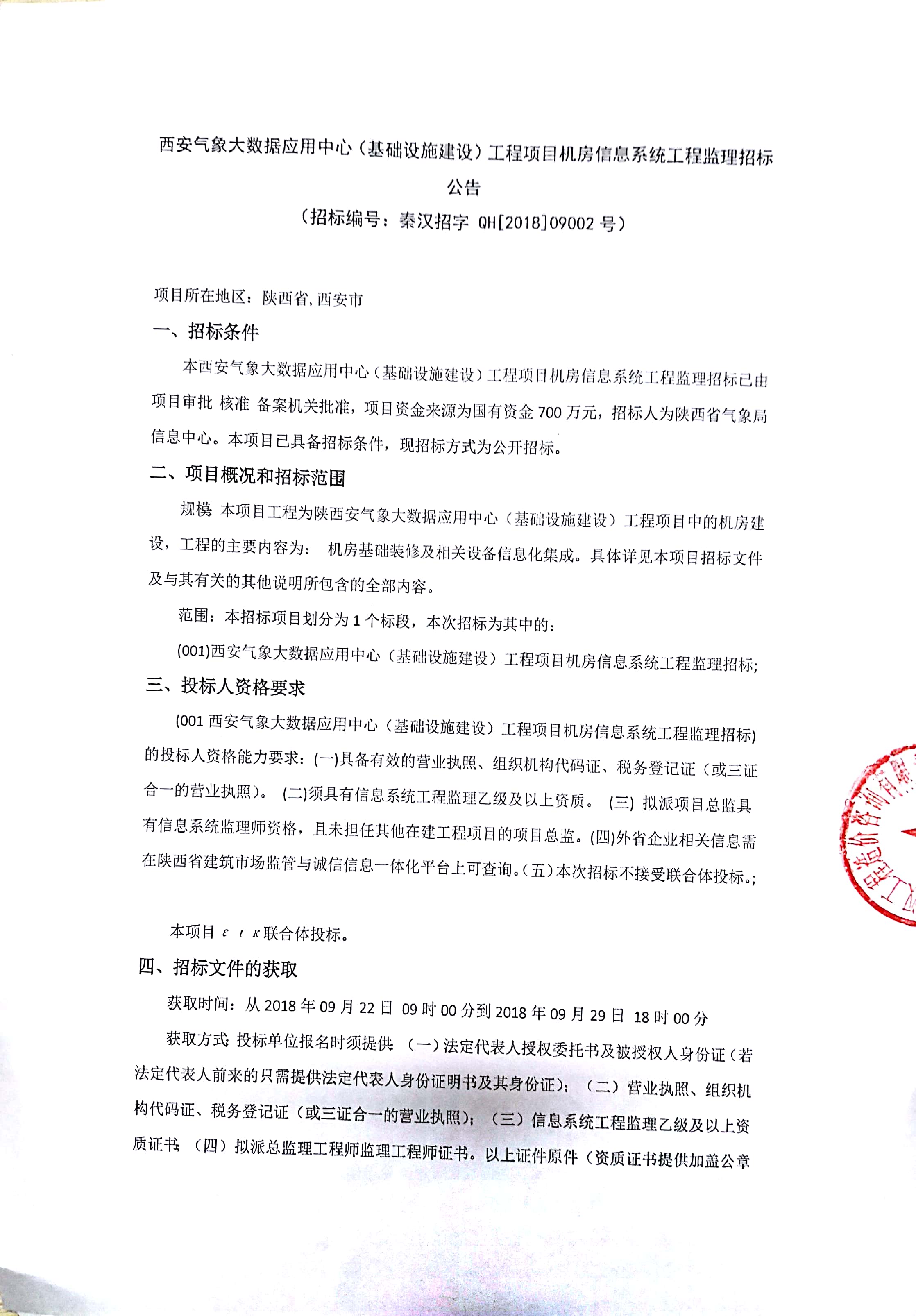 西安气象大数据应用中心(基础设施建设)工程项目机房信息系统工程监理招标